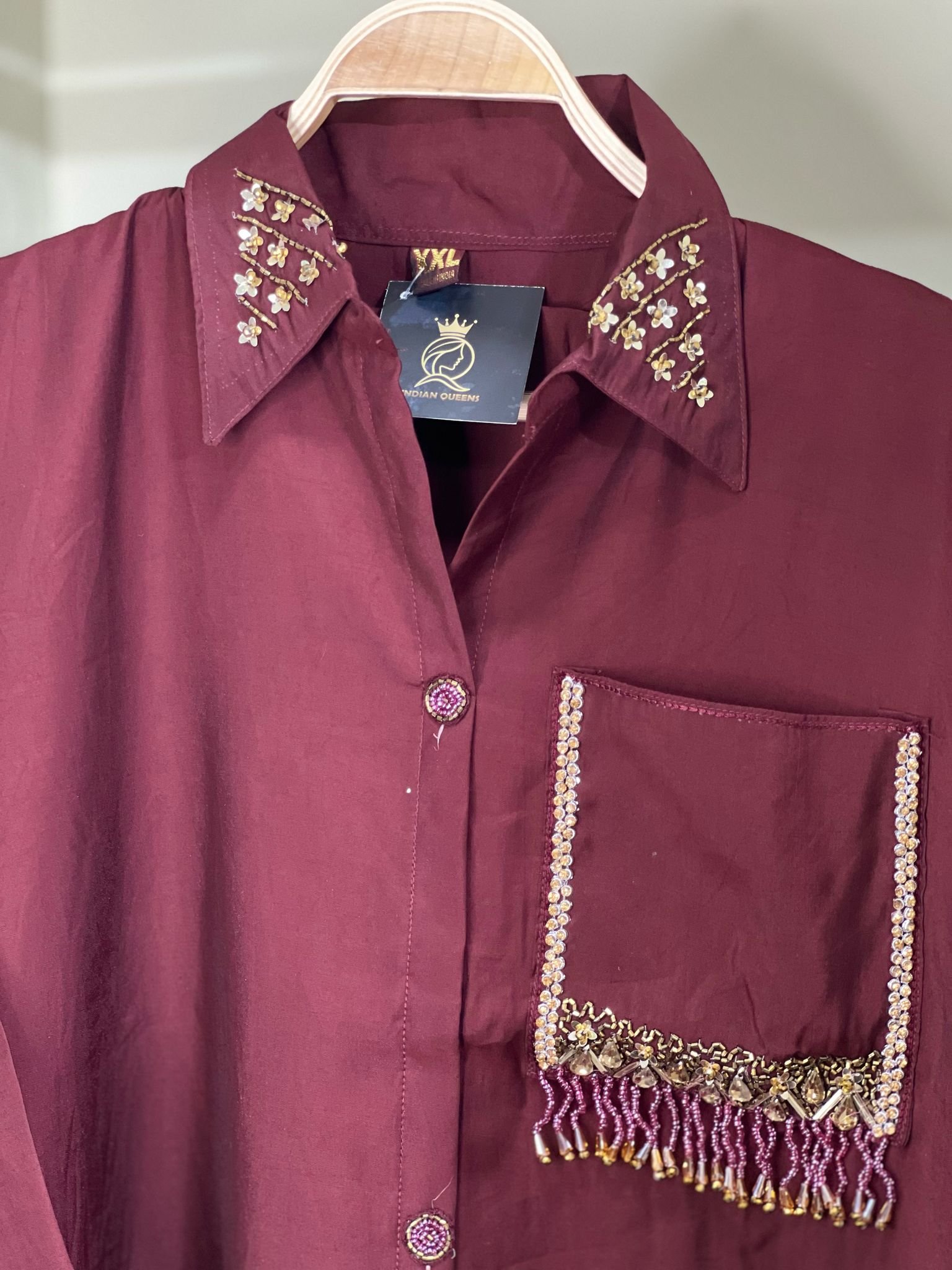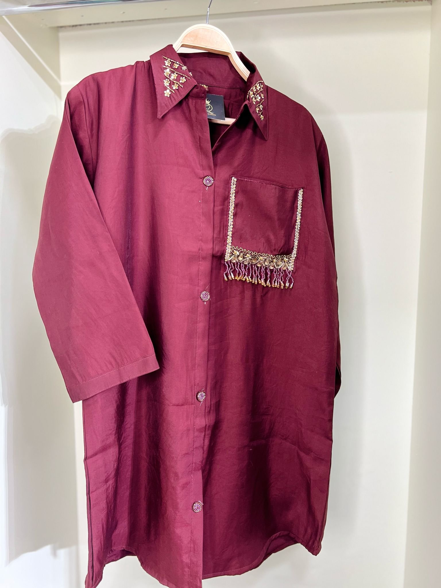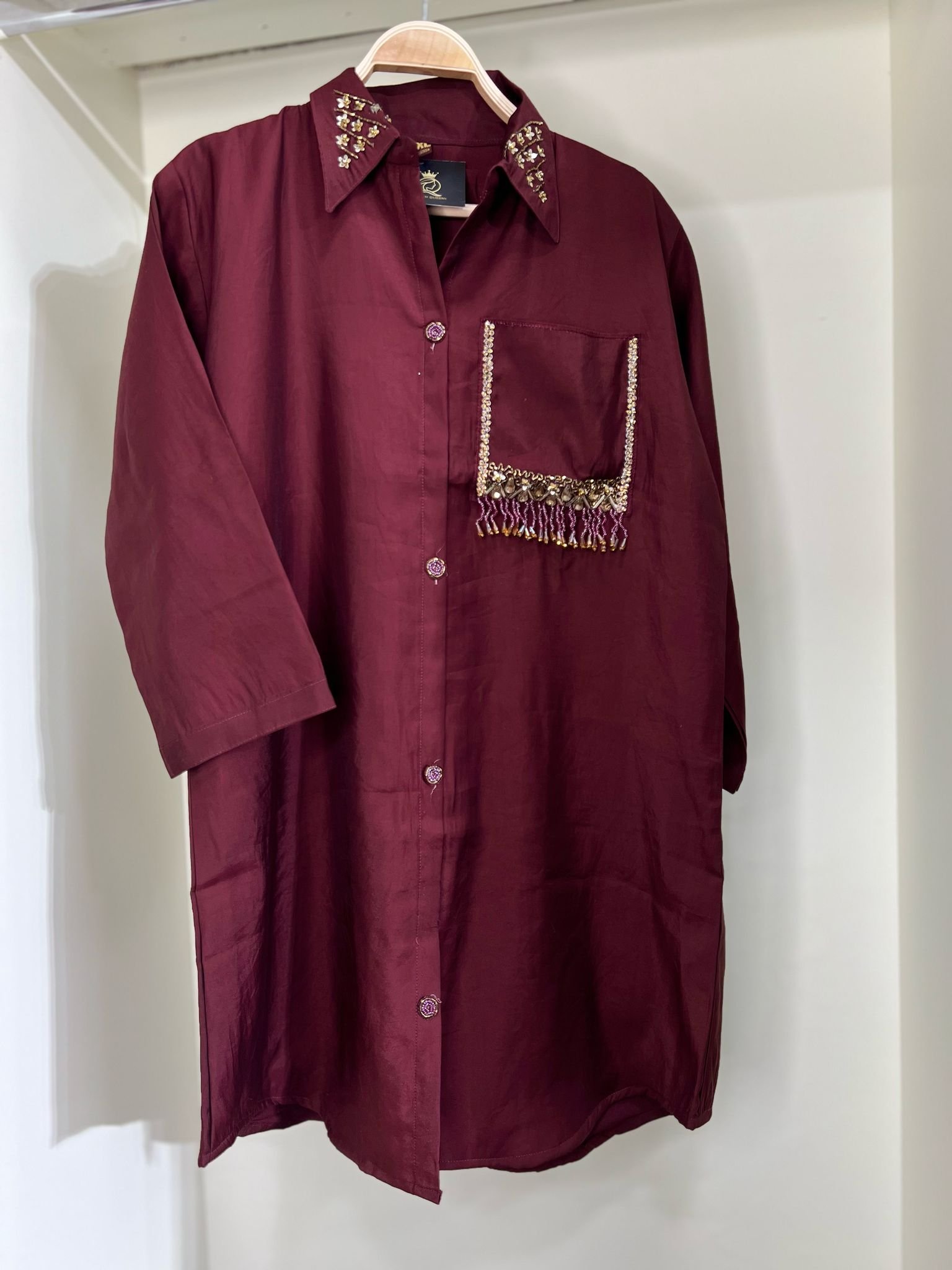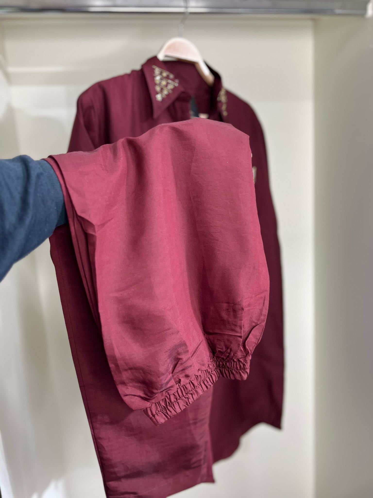 CO-ORD SET DARK MEHROON IN SILK FABRIC EMBROIDERY ON NECK OR POCKIT